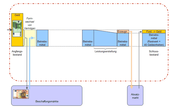 Der Wert der Betriebsmittel wird durch die dargestellten Prozesse sukzessive auf die Erzeugnisse übertragen. Logischerweise kann ein Betriebsmittel im Verlaufe seiner Nutzung insgesamt nicht mehr Wert abgeben, als es selbst im Zeitpunkt seiner Anschaffung besaß.