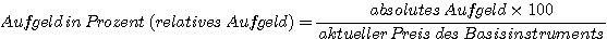 Das (relative) Aufgeld gibt bei einem Kaufoptionsschein an, um wieviel Prozent teurer der Erwerb des Basiswerts durch Kauf und sofortige Ausübung des Optionsrechts zum Betrachtungszeitpunkt gegenüber dem Direkterwerb des Basiswerts ist.