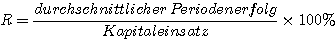 Sie wird mit einem statischen Verfahren ermittelt. Wie bei allen statischen Verfahren wird hierbei der konkrete zeitliche Anfall der Zahlungen nicht berücksichtigt. Statt dessen wird mit Durchschnittswerten operiert. Allgemein ermittelt man die Rentabiltät R, indem der erreichte Erfolg ins Verhältnis zum erforderlichen Kapitaleinsatz gesetzt wird: